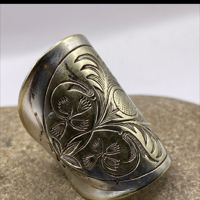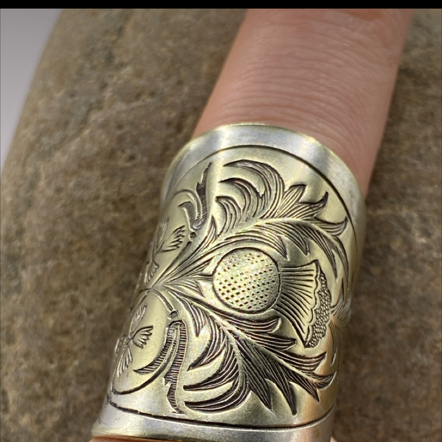 Torridon, Highlands, 1912 — Dusk. In the remote hills above Torridon, Fiona MacIntyre held the silver spoon in her hands, its handle engraved with curling thistles, their sharp beauty echoing the rugged Highlands. Skilled hands reshaped it into a wide cuff ring, wrapping the finger like a protective embrace. Sliding it on, she felt the silver settle firmly, as if the thistle itself lent strength — guarding not only her hand but her spirit. The ring carried a lesson: true protection comes not from force, but from vigilance, care, and respect for what sustains you. Fiona felt it in every movement, every breath — the thistle cuff reminded her that when the soul is honored and the heart watched over, the wearer walks through life with courage, resilience, and serenity.